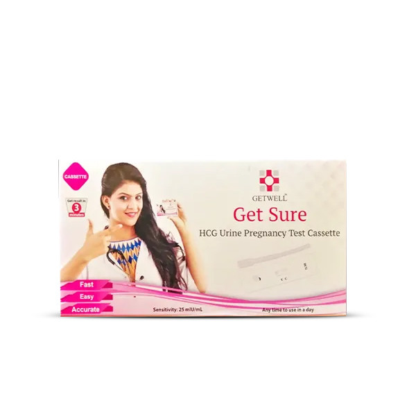 Getwell Get Sure Pregnancy Test Cassette is a reliable and easy-to-use HCG urine test designed to give clear results within just 3 minutes. With high sensitivity (25 mIU/mL), it detects pregnancy early and delivers accurate readings anytime during the day. This one-step cassette test ensures a hassle-free home testing experience for women looking for quick confirmation.