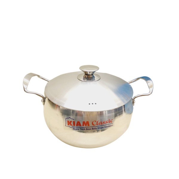 The Kiam Classic Belly Shape Saucepan, with a 26 cm diameter, is designed for efficient and healthy cooking. It features a heavy, thick base for even heat distribution, an induction bottom for compatibility with various cooktops, and a belly shape for easy stirring and mixing. The saucepan is made from 99.97% pure aluminum ingot, ensuring durability and long-lasting performance, and is designed to resist becoming black or rough even with extended use.
