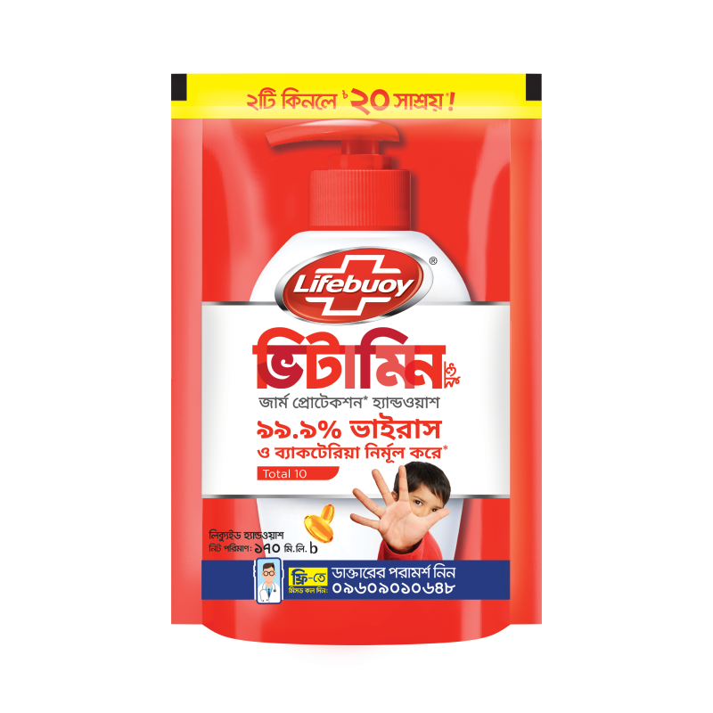 Lifebuoy Total 10 Hand Wash হাত ধোয়াকে আগের চেয়ে দ্রুত এবং আরও কার্যকর করে তোলে! মোট 10টি হ্যান্ডওয়াশে রয়েছে উন্নত জীবাণু সুরক্ষা উপাদান, অ্যাক্টিভ ন্যাচারোল শিল্ড এবং মাত্র 10 সেকেন্ডে 99.9% জীবাণু সুরক্ষা দেয়! লাইফবুয় মোট 10 হাত ধোয়া জীবাণুর বিস্তার রোধ করে, পরিবারকে সংক্রমণ সৃষ্টিকারী জীবাণু থেকে নিরাপদ রাখে। এটি বিশেষভাবে আপনাকে এবং আপনার পরিবারকে উচ্চতর জীবাণু সুরক্ষা দেওয়ার জন্য ডিজাইন করা হয়েছে। তাই এখন সংক্রমণ থেকে 1 ধাপ এগিয়ে থাকুন, এবং আপনার হাত পরিষ্কার এবং সুস্থ রাখুন। এখনকার বাচ্চারা সুপারফাস্ট। তারা সবসময় তাড়াহুড়ো করে, এমনকি হাত ধোয়ার সময়ও। সাধারণ সাবান জীবাণু মারতে 1 মিনিট পর্যন্ত সময় নেয় - কিন্তু বাচ্চারা কি পুরো 1 মিনিটের জন্য তাদের হাত ধুতে পারে? আমাদের নয়! এজন্য আমরা লাইফবয় টোটাল 10টি জীবাণু সুরক্ষা হ্যান্ড ওয়াশ লিকুইড তৈরি করেছি – সুপারফাস্ট বাচ্চাদের জন্য সুপারফাস্ট হ্যান্ড ওয়াশ! আমাদের Active Naturol Shield সূত্র দ্বারা চালিত, এটি মাত্র 10 সেকেন্ডে 99.9% জীবাণুকে মেরে ফেলে, আপনার বাচ্চাদের টাইফয়েড, কলেরা, সর্দি এবং ফ্লাসের মতো সংক্রমণ থেকে 1 ধাপ এগিয়ে রাখতে সুপারফাস্ট হাত সুরক্ষা প্রদান করে। তাই এখন চিন্তা করবেন না যে তারা স্লো সাবান দিয়ে যথেষ্ট সময় ধরে হাত ধুচ্ছেন কিনা!