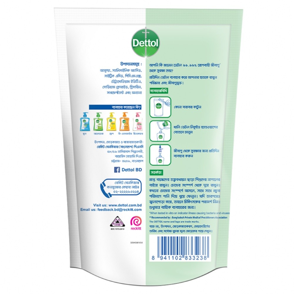 Dettol Handwash provides everyday protection and protects from 100 illness causing germs as per standard testing protocol. Dettol Fresh gives you refreshing citrus freshness. Daily use of Dettol Handwash keeps your hand clean and germ free. Dettol Handwash Liquid is recommended by Bangladesh Private Medical Practitioners Association.